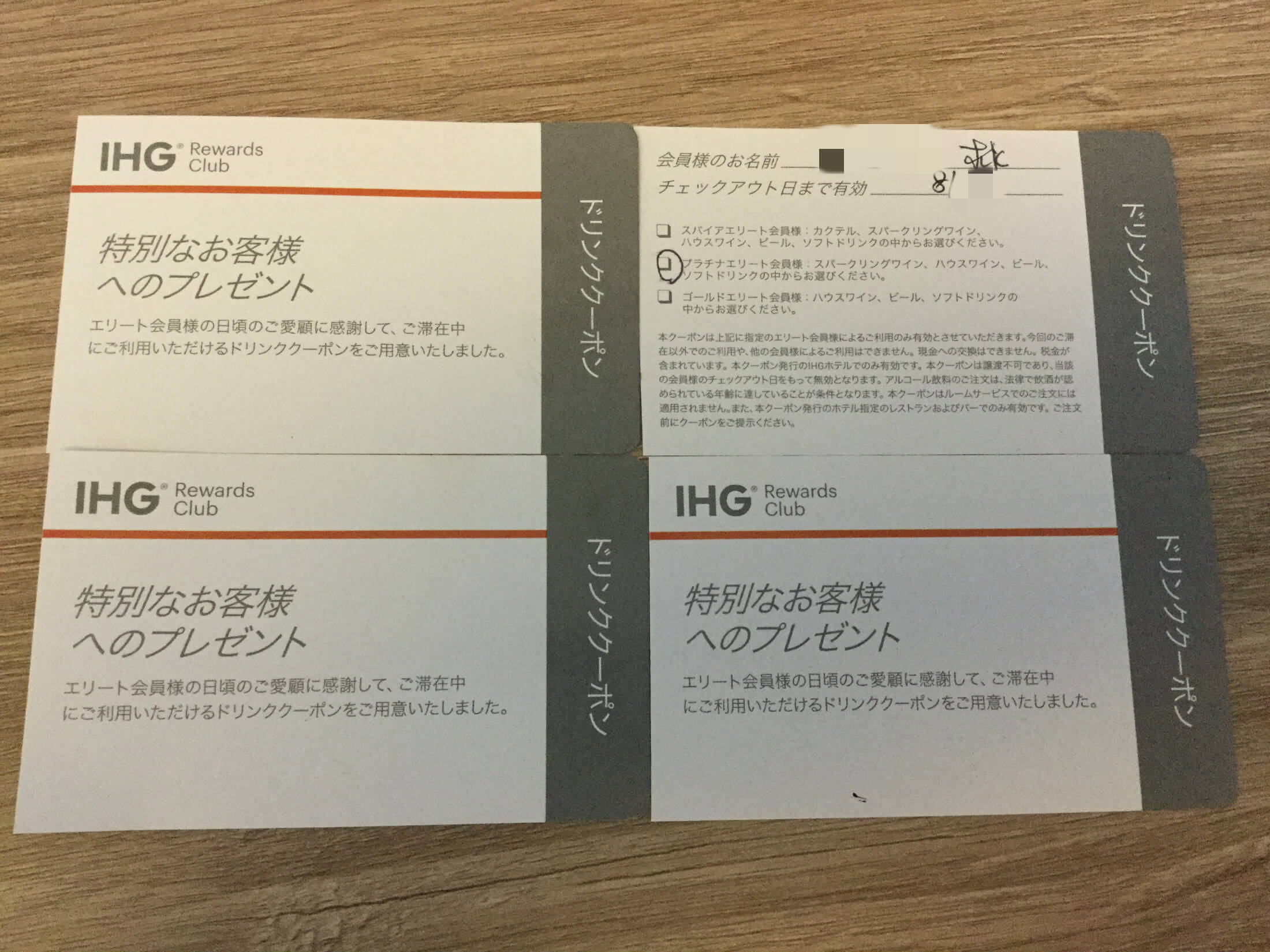 最初はポイントに使用かなぁと思っていましたが、チェックイン時にお聞きするとドリンクチケットを4人分頂けるということでしたのでドリンクチケットにしました。プラチナ会員だとポイントは600ポイント(約360円相当)ですのでドリンクの方がお得ですからとてもありがたいです。