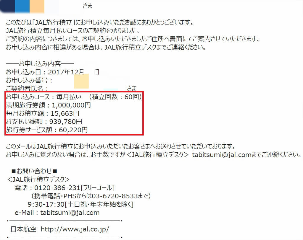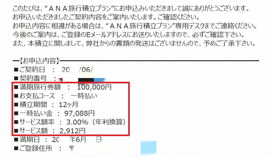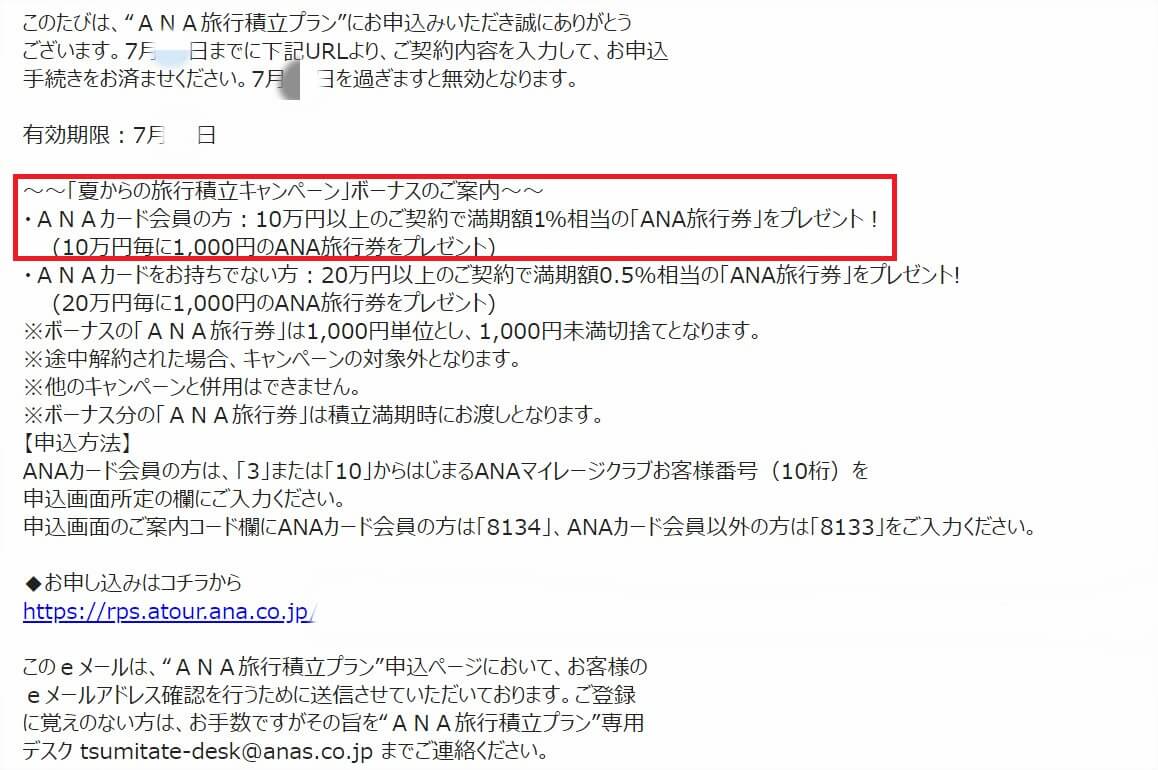 僕が申し込んだ時のメールです。赤四角で囲ったように満期額の1%相当(10万円毎に1000円)の旅行券プレゼントと記載されています。