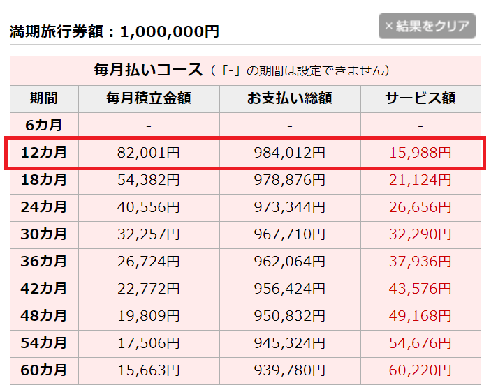毎月払いコースを考えてみましょう。12か月積立で満期時に100万円の旅行券を受け取ると仮定します。