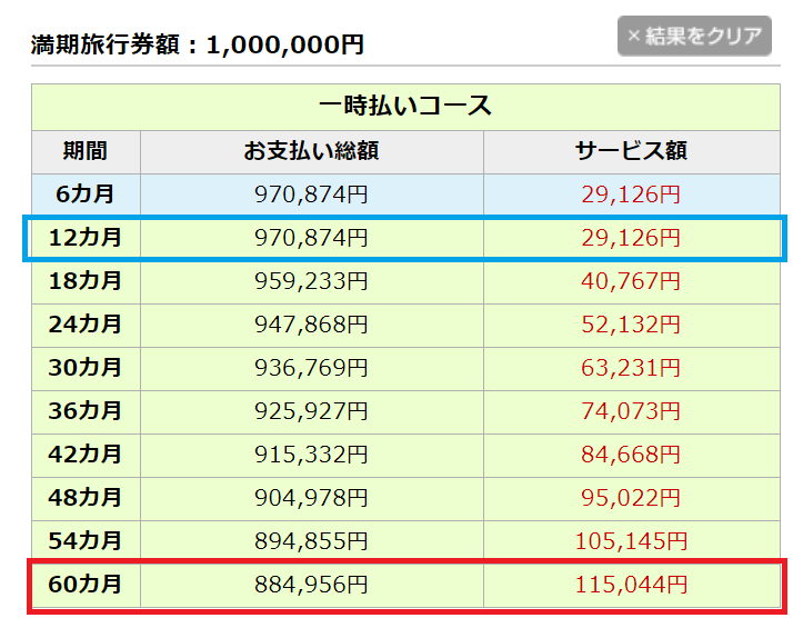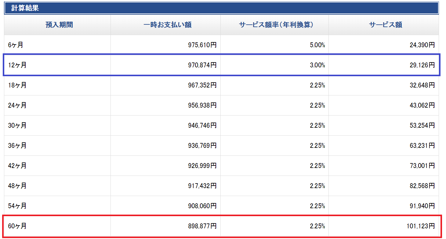 しかし、一時払いコースも12ヶ月を超えた積立だとサービス額は3%になりません。例えば60か月100万円満期で一時払いコースの場合はANAの場合は下のシミュレーションの赤四角で囲った部分のようにサービス額は101123円となり、サービス額は2.25%に下がるのです。