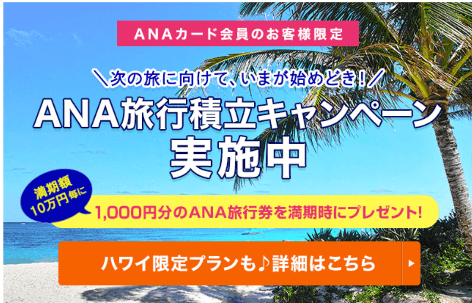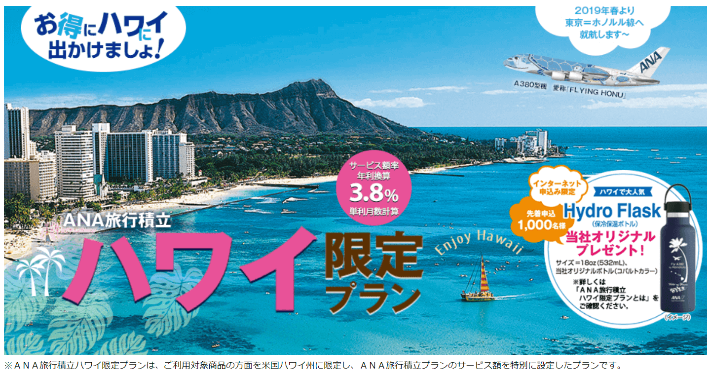 ANA旅行積立にもハワイ限定プランが登場しており、年利が3.8%と通常プランより優遇されています。ANAでハワイ旅行を考えている方は考えてみてもいいかもしれません。