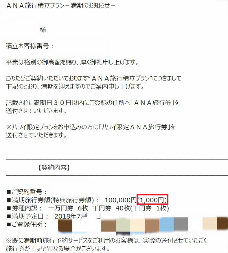 下のメールのように満期のお知らせが来た時に赤四角で囲ったボーナス分の旅行券額がきちんと表示されています