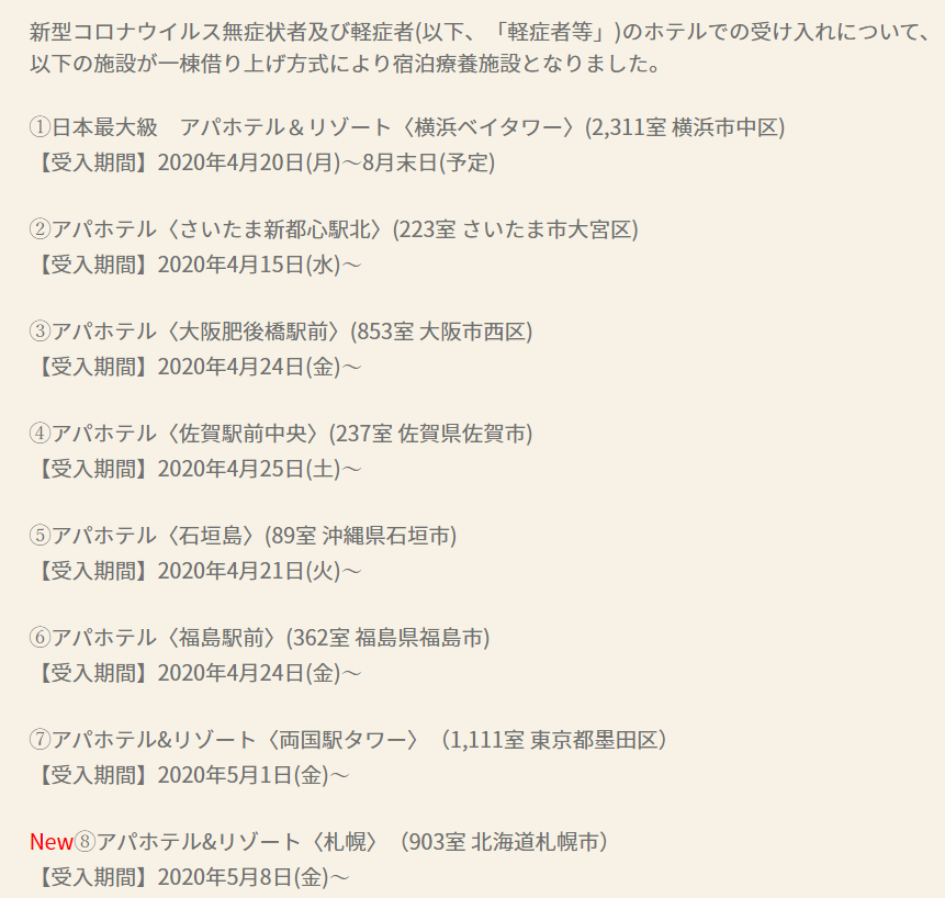 また今回アパホテルグループは新型コロナウイルス感染拡大防止のため、無症状者及び軽症者のホテル受け入れ(一棟借り上げ方式)を行っています。現在は以下の8ホテルが対象となっています。