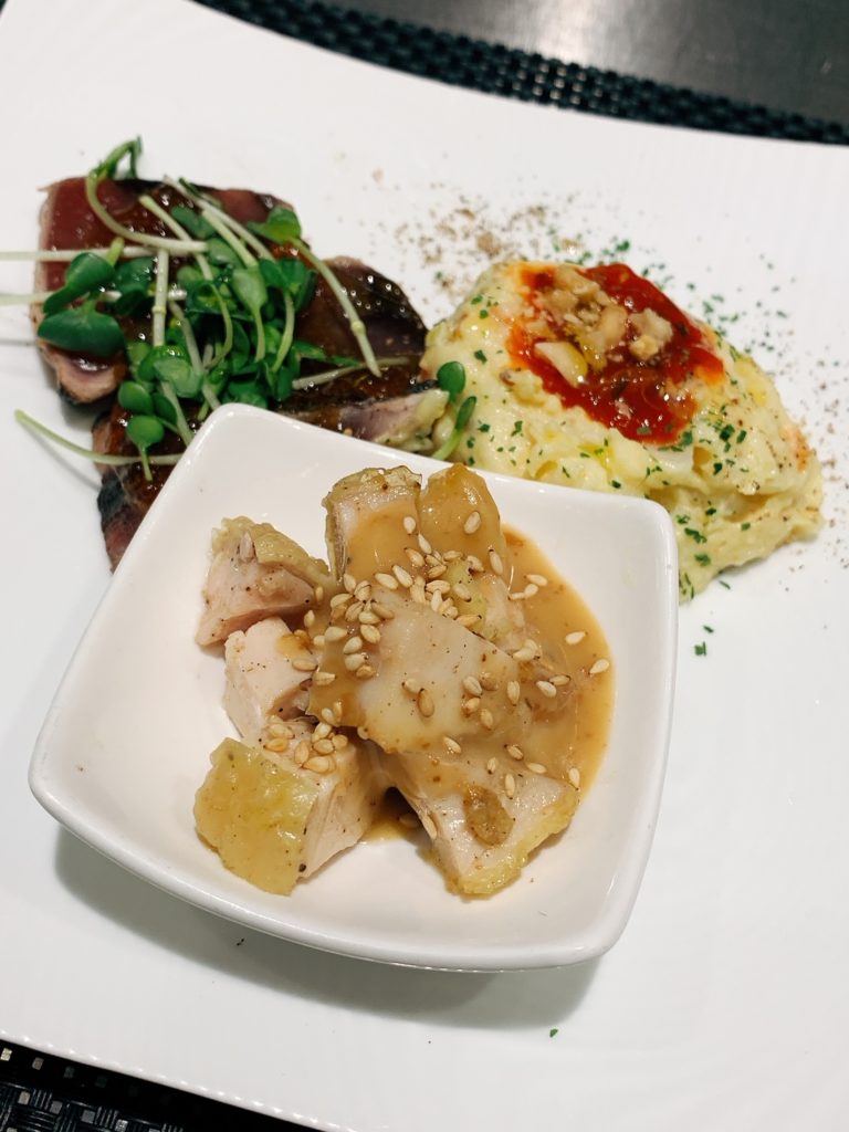 鶏の冷製、ポテトサラダ、カツオのタタキの盛り合わせでした