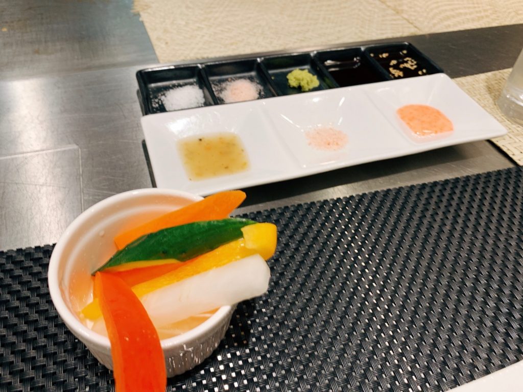 柚子胡椒ソース、明太子ソース、塩につけて頂きます