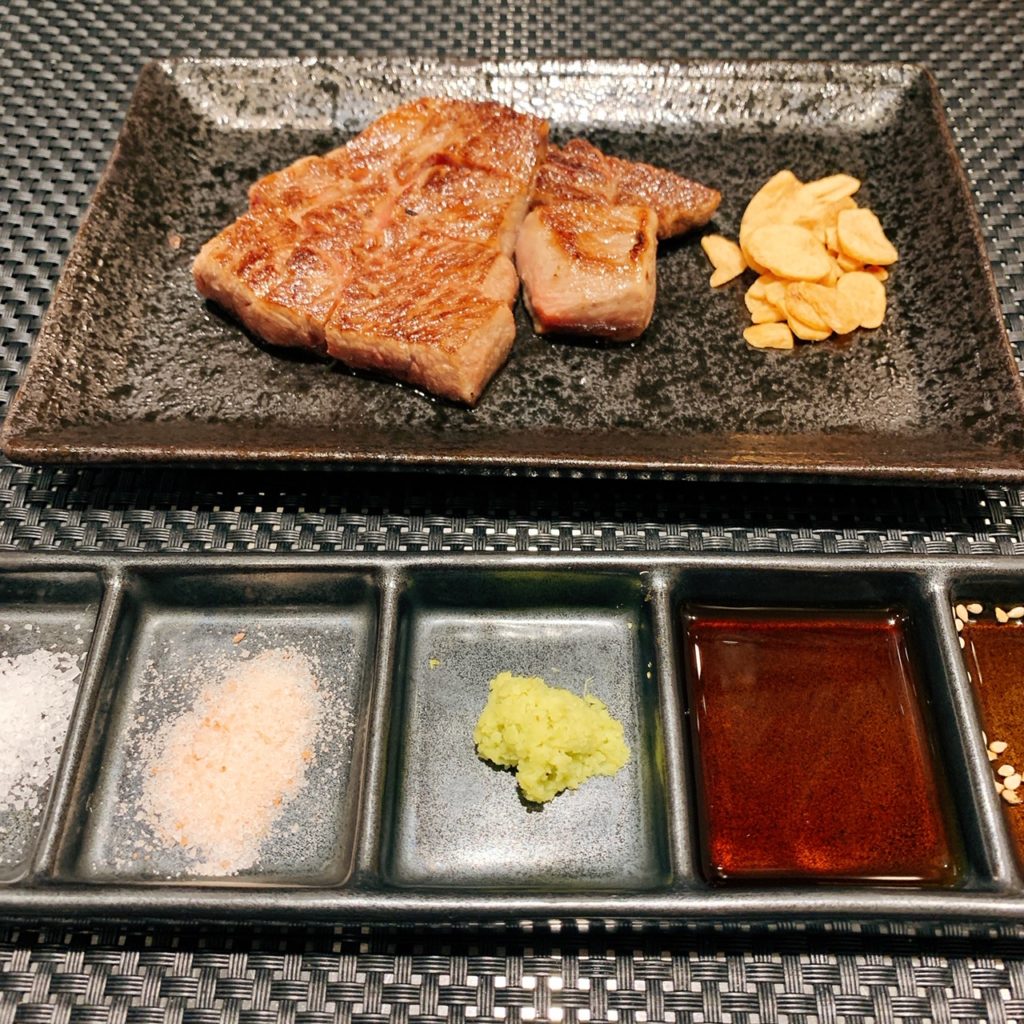塩、岩塩、わさび、にんにく醤油、ポン酢を付けて頂きます。本当に尾崎牛?と半信半疑でしたがお肉は柔らかくてとても美味しくわさびと塩のみで頂きました!