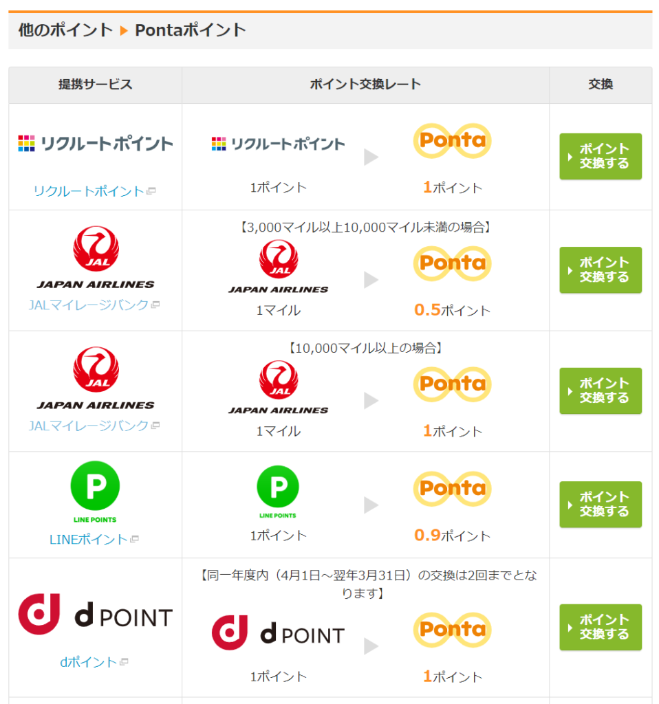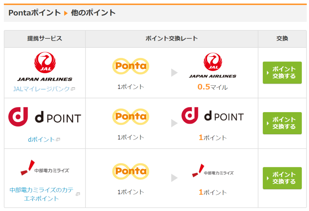 Pontaポイントは、JALマイルだけでなくdポイント、中部電力ミライズのカテエネポイントへの交換が可能となっています。