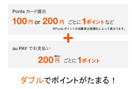 先ほど述べたようにau PAYアプリを立ち上げPontaカードを提示しauPAYで支払いすることで、au PAYやau PAYカードの決済分と加盟店でのPontaポイントが同時にダブルで貯まるようになりました。Pontaカードの提示で0.5%~1%(提携者によって異なる)が、au PAYの決済で0.5%が貯まります。