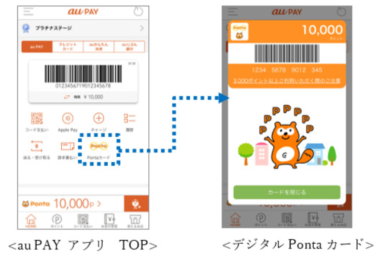 au PAYアプリでau IDとPontaを連携すると、au PAYアプリからデジタルPontaカードがワンタッチで立ち上げられる機能が搭載されました。つまり、複数のアプリやカードを立ち上げなくても「au PAY アプリ」ひとつでカード提示によるポイント獲得から決済までが可能になりました。