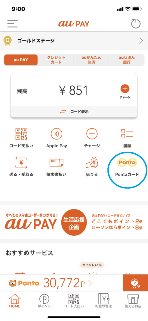 au PAYアプリをアップデートすれば下の画像のように「Pontaカード」という項目が出現しました。こちらをタップすればワンタッチでデジタルPontaカードが立ち上がります。