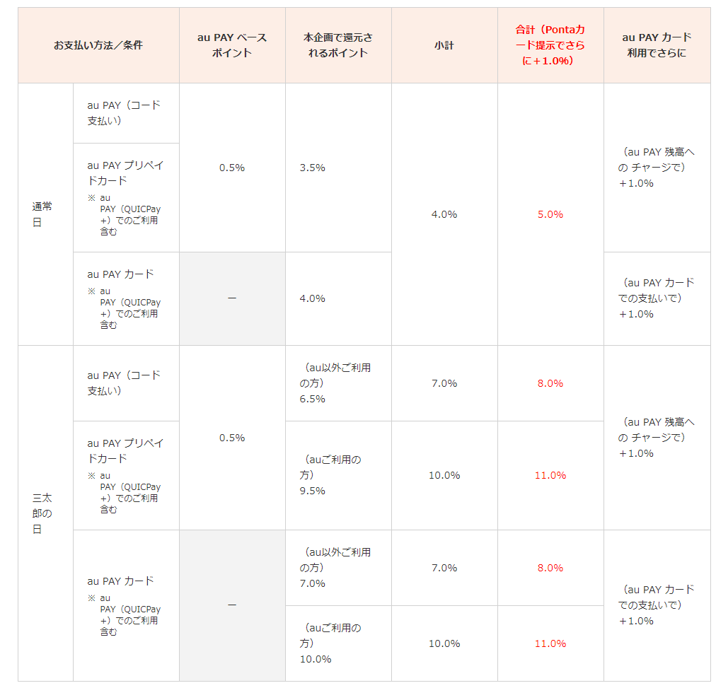 ・au Pay決済で4%還元。さらにPontaカード提示でプラス1%の合計最大5%還元。