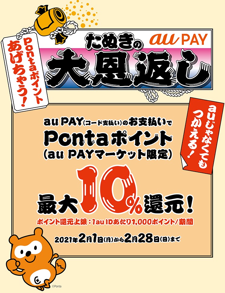 au PAYが2021年3月末まで実施中のキャンペーン「たぬきの恩返し」第3弾の2021年2月はスーパー、ドラッグストア、JAグループ、カインズすかいらーくグループ、ローソンでの買い物で20%のPontaポイントが還元!さらに「au PAY マーケット」限定で使えるポイントを10%還元!キャンペーンの内容をまとめます。