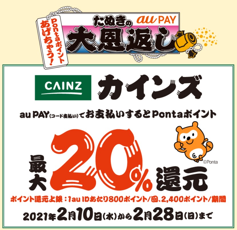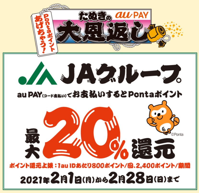 au PAYが決済金額の最大20%のPontaポイントを還元するキャンペーン「たぬきの恩返し」!第3弾となる2021年2月はスーパー、ドラッグストア、JAグループ、カインズ、すかいらーくグループ、ローソンでの買い物で20%のPontaポイントを還元するキャンペーンとなりますので内容をまとめました。