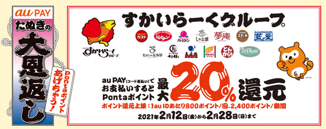 2021年2月12日から「たぬきの大恩返し」キャンペーンとして、ガストやバーミヤンなど全国のすかいらーくグループ店舗で20%のPontaポイントを還元するキャンペーンを開催すると追加発表