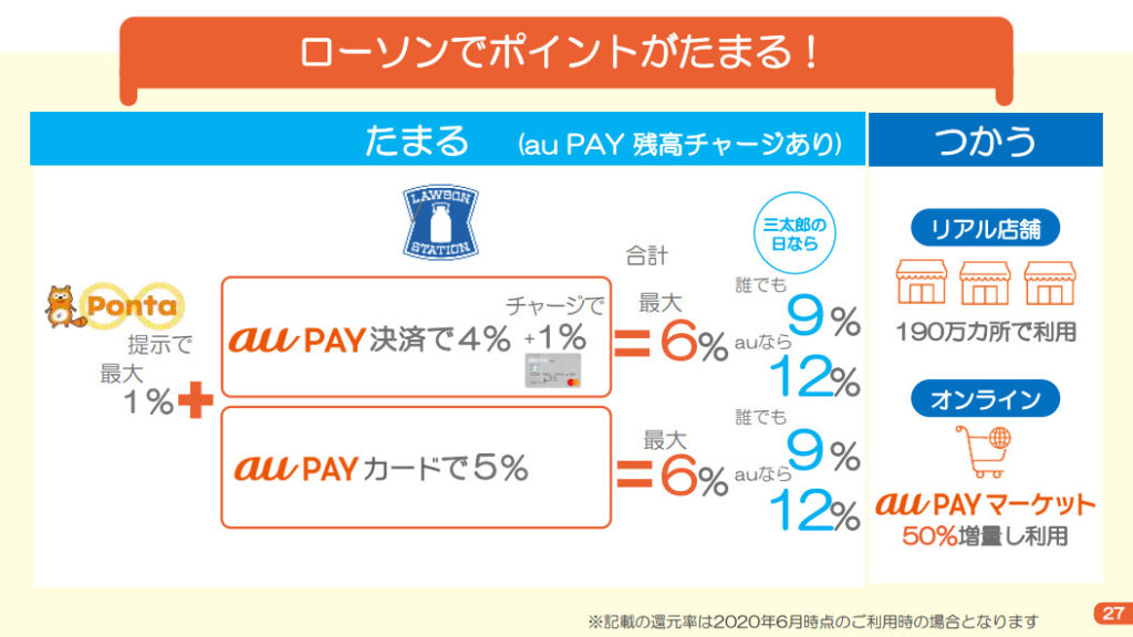 また、「三太郎の日(3のつく日:毎月3日・13日・23日)」では、ローソンでPontaカードを提示してau PAYやau PAY カードで決済すると非auユーザーでも8%還元となります。また、auユーザーの場合は11%還元になります。