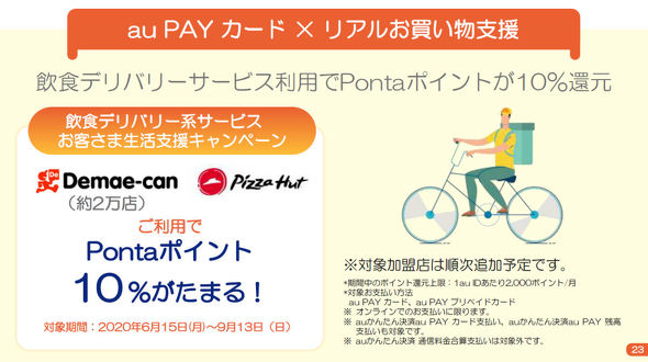 2020年6月15日(月)~9月13日(日)までの間、出前館とピザハットで、au PAY カードを利用して決済すると、Pontaポイントが10%還元されます。期間中のポイント上限は1 auIDにつき2,000ポイント/月となります。