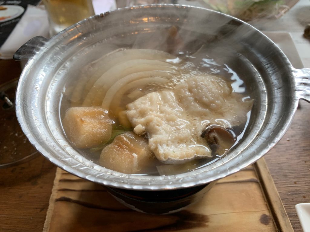 まずは鱧の小鍋です。鱧、玉ねぎ、豆腐、水菜、麩などが入っています。鱧から良い出汁が出ていて美味しいです。