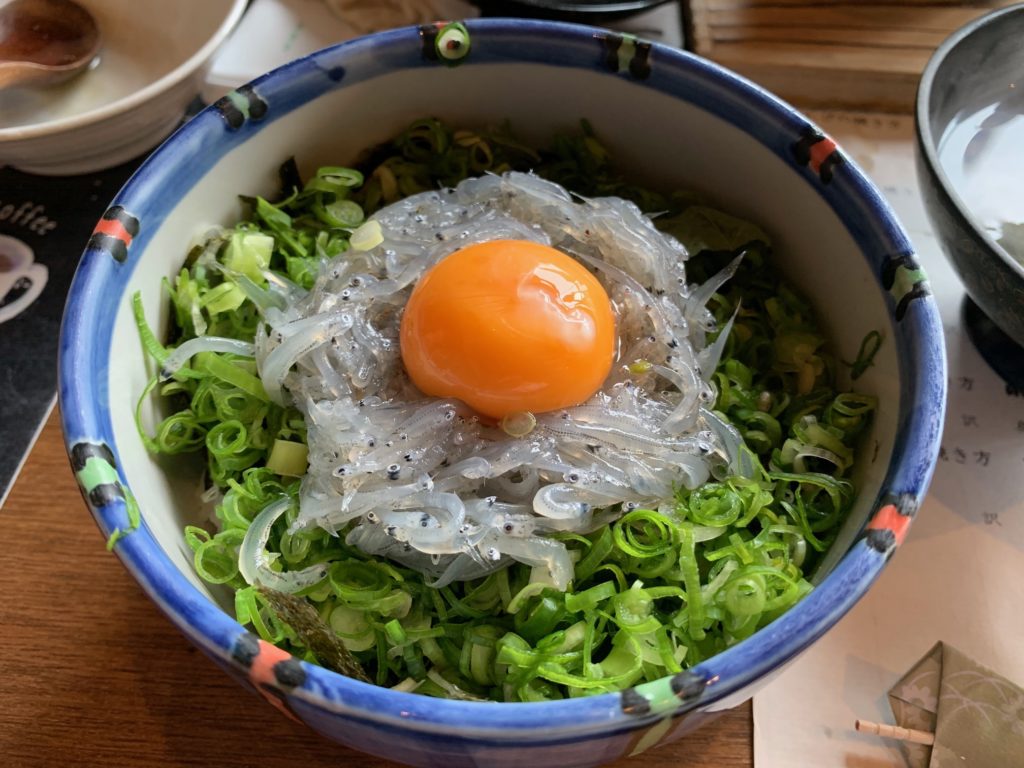 僕は「しらす丼」を選択しました。ネギがぎっしり敷き詰められた上に、盛りだくさんの生しらす!そして、生たまごの黄身がトッピングされています。