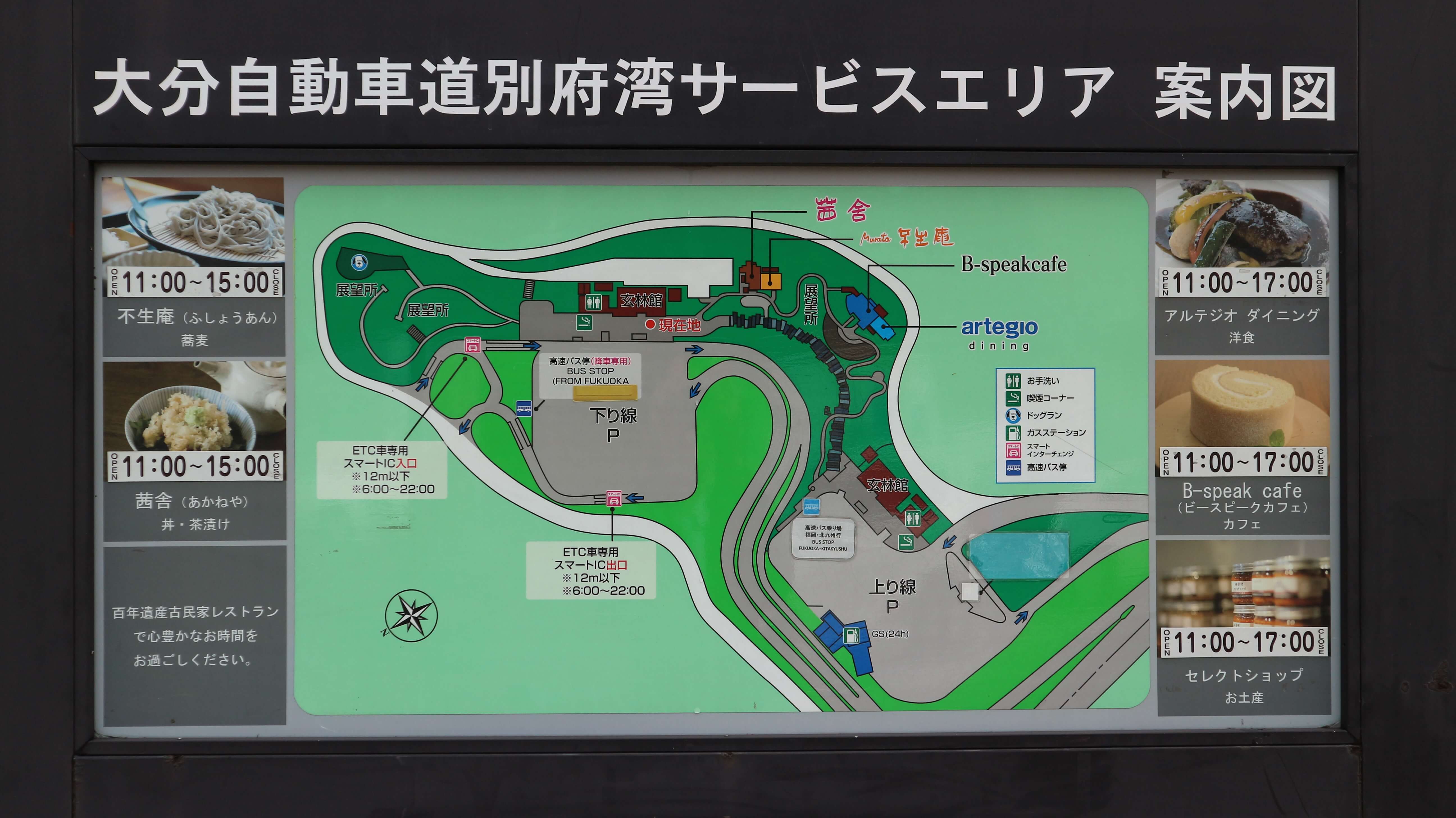 別府湾サービスエリアの案内図の写真です。主に以下のような施設があります。