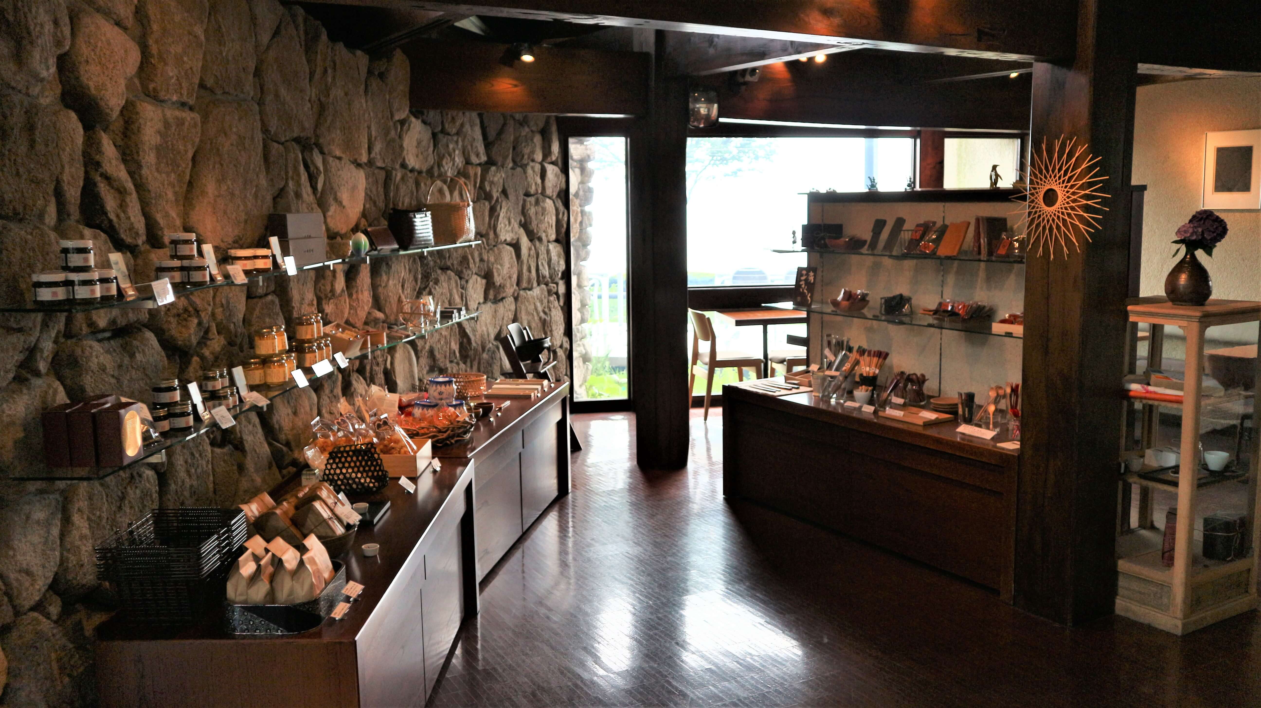 店内には地元の山から切り出した石壁が印象的なセレクトショップも併設されており、有名な粒マスタードを初めとして、柚子胡椒・オリジナルコーヒーなど山荘無量塔のフードや大分で創作活動をする作家さんの作品などが販売されています。いいお値段しますがしゃれた大分土産を探しておられる方には最適だと思います。