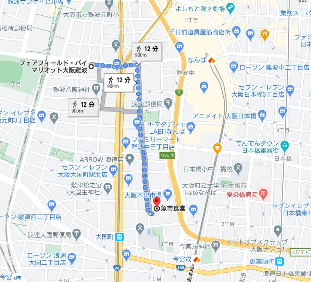 フェアフィールド大阪難波から木津市場までは徒歩10分ほどです