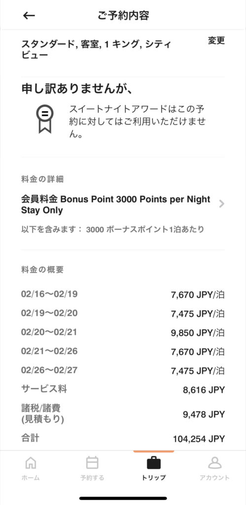 1泊あたり3000ボーナスポイントが加算される「会員料金 Bonus Point 3000 Points per Night Stay Only」で1泊平均税サ抜7833円/泊です。