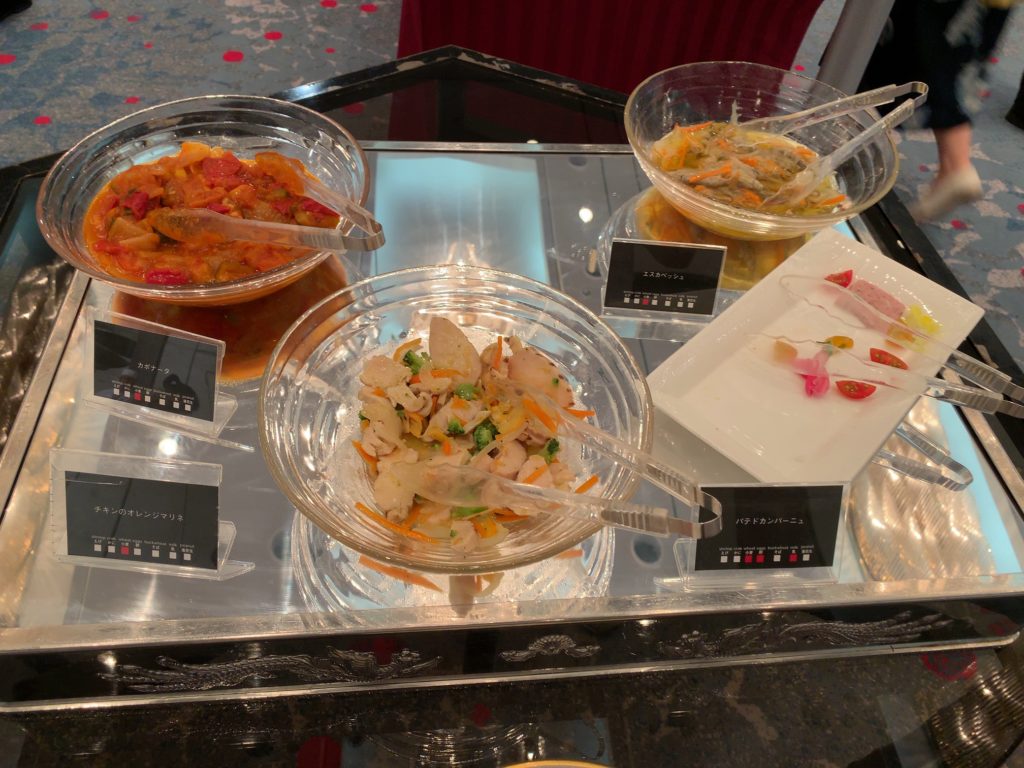 カルパッチョ、パテドカンパーニュ、タブレ(海老・烏賊・蛸)、パンプキンとナッツのサラダ、ホタテとサーモンの海鮮サラダ