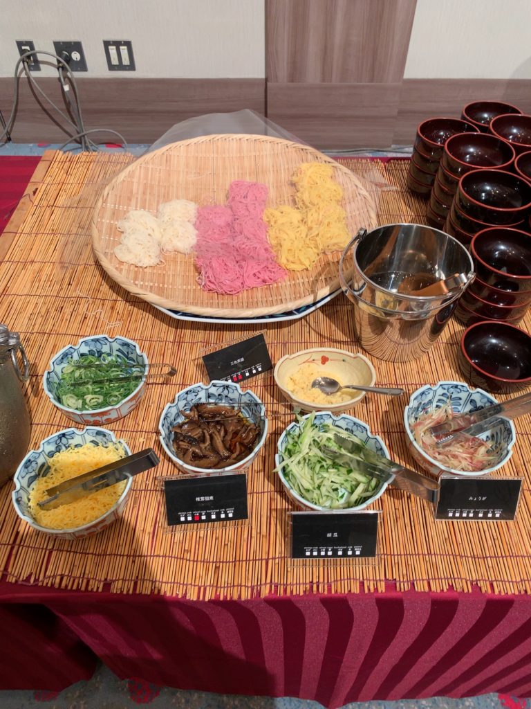 三色素麺(椎茸佃煮・胡瓜・みょうが・錦糸卵・ねぎ・生姜)