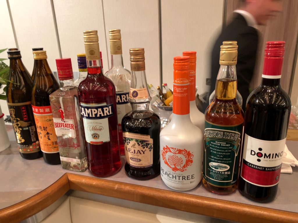 生ビール(キリン一番搾り)、瓶ビール(キリン)、芋焼酎(黒霧島)、麦焼酎(二階堂)、白ワイン(ピノグリージョ)、赤ワイン(カルベネソービニオン)、ウイスキー(ベン・ネヴイス)、カクテル(カシス・ジン・ピーチツリー・カンパリ)