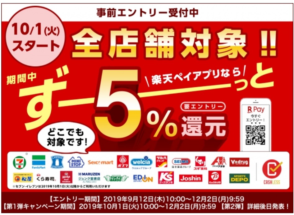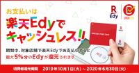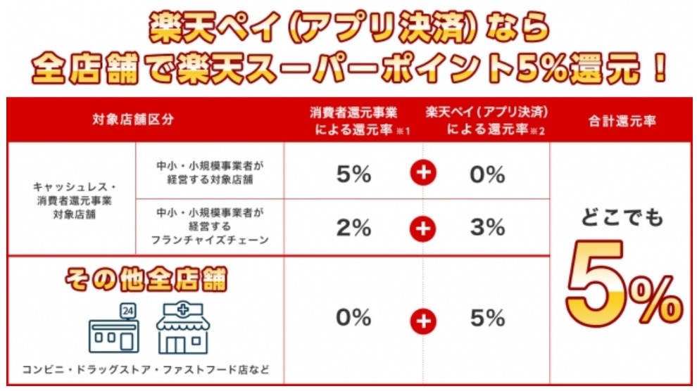 楽天ペイではキャッシュレス・消費者還元制度によるポイント還元と組み合わせ、「楽天ペイ(アプリ決済)」を導入する全店舗において「楽天スーパーポイント」が5%還元となるキャンペーンを行います。