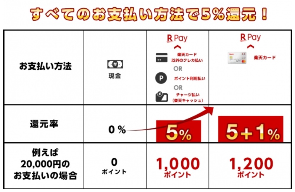 得しているような損しているようなシステムですが分かりやすいと言えば分かりやすいですね。ちなみに楽天カードを利用して支払うとさらに1%上乗せされ6%還元となります。