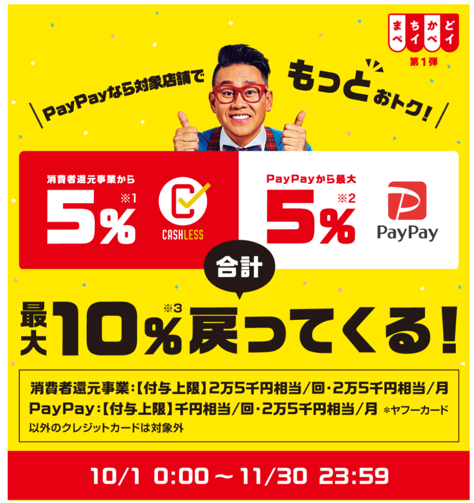 キャッシュレス・消費者還元事業開始に合わせて「まちかどペイペイ」というキャンペーンが開始となります。このキャンペーンは還元事業の5%PayPayボーナスに加え、最大5%を加算し、最大10%のPayPayボーナスが獲得できるものです。