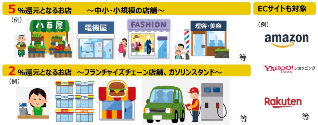 小売・飲食・サービスなどの一般の中小店舗では5%、フランチャイズチェーンやガソリンスタンドでは2%の還元を受けることができます。ECサイト上の中小店舗も対象です。
