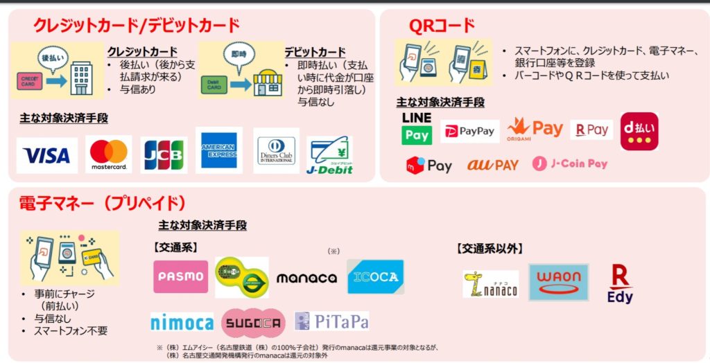 対象のキャッシュレス決済の詳細については以下のリンクをご参照下さい