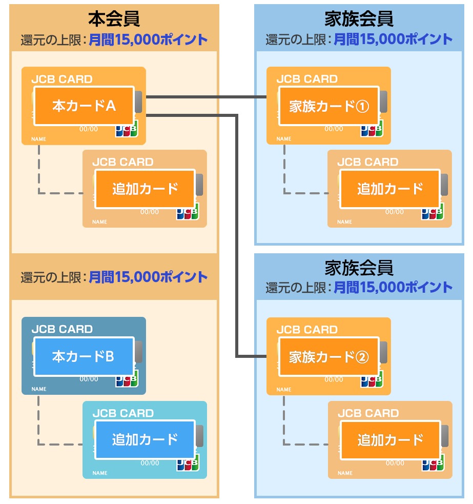 一方JCBカードは本カードと家族カードの還元上限のカウントは別となっておりそれぞれ15000円分となっています。