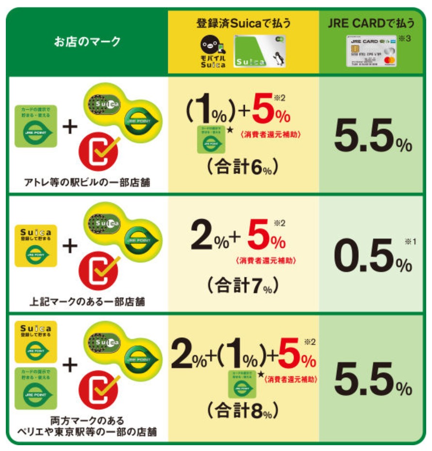 登録済Suicaで決済すると20円(税込)につきJRE POINT1ポイント(2~5%)が還元されます。また、コンビニチェーンや飲食チェーン等、フランチャイズチェーン傘下の店舗の場合は50円(税込)につき1ポイント(2%)還元となります。 JRE POINT登録済のSuicaが必要となるのでまだ登録されていない方は登録が必要です。