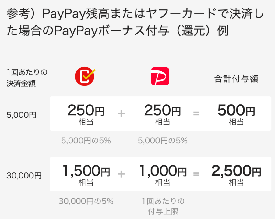 まちかどペイペイの付与上限が1000円/回であることに注意が必要です。つまり1 回あたりの決済金額が 20000 円を超える部分には、還元事業による 5%の還元のみが適用され、PayPayボーナスが満額獲得できないことに注意が必要です。
