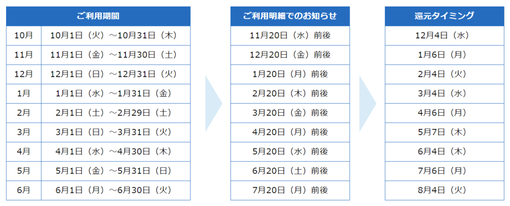 還元時期:3か月に1回(2019年10月1日~12月31日利用分のポイント付与は2020年1月中旬など)
