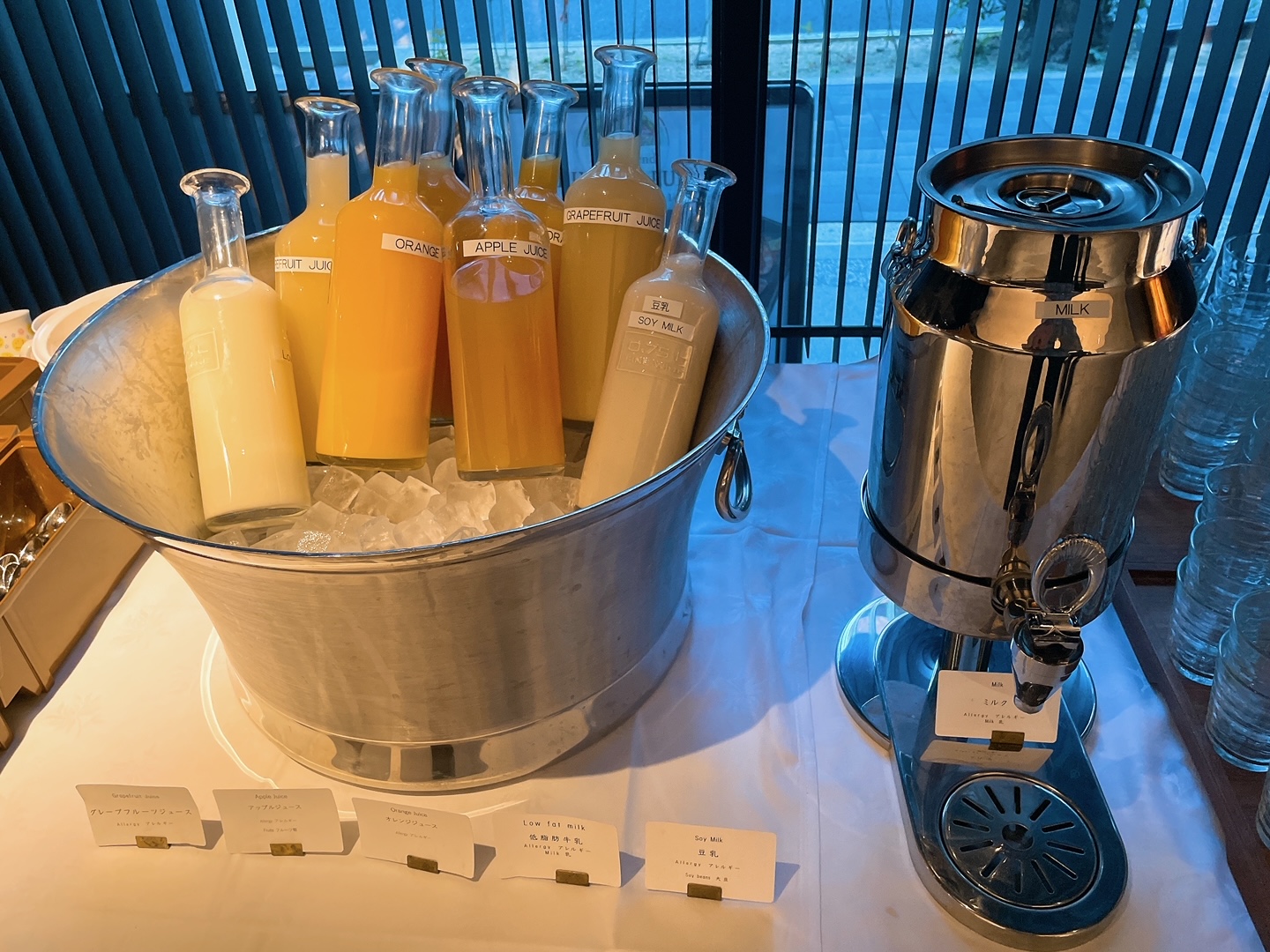 オレンジジュース、アップルジュース、グレープフルーツジュース、牛乳、低脂肪牛乳、豆乳