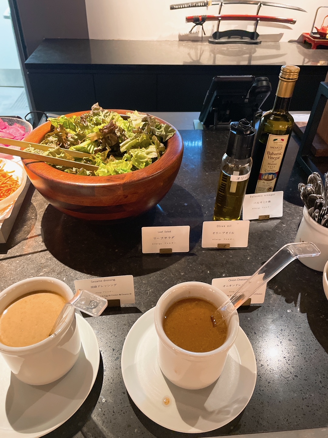 オリーブオイル、バルサミコ酢、オニオンドレッシング、胡麻ドレッシング