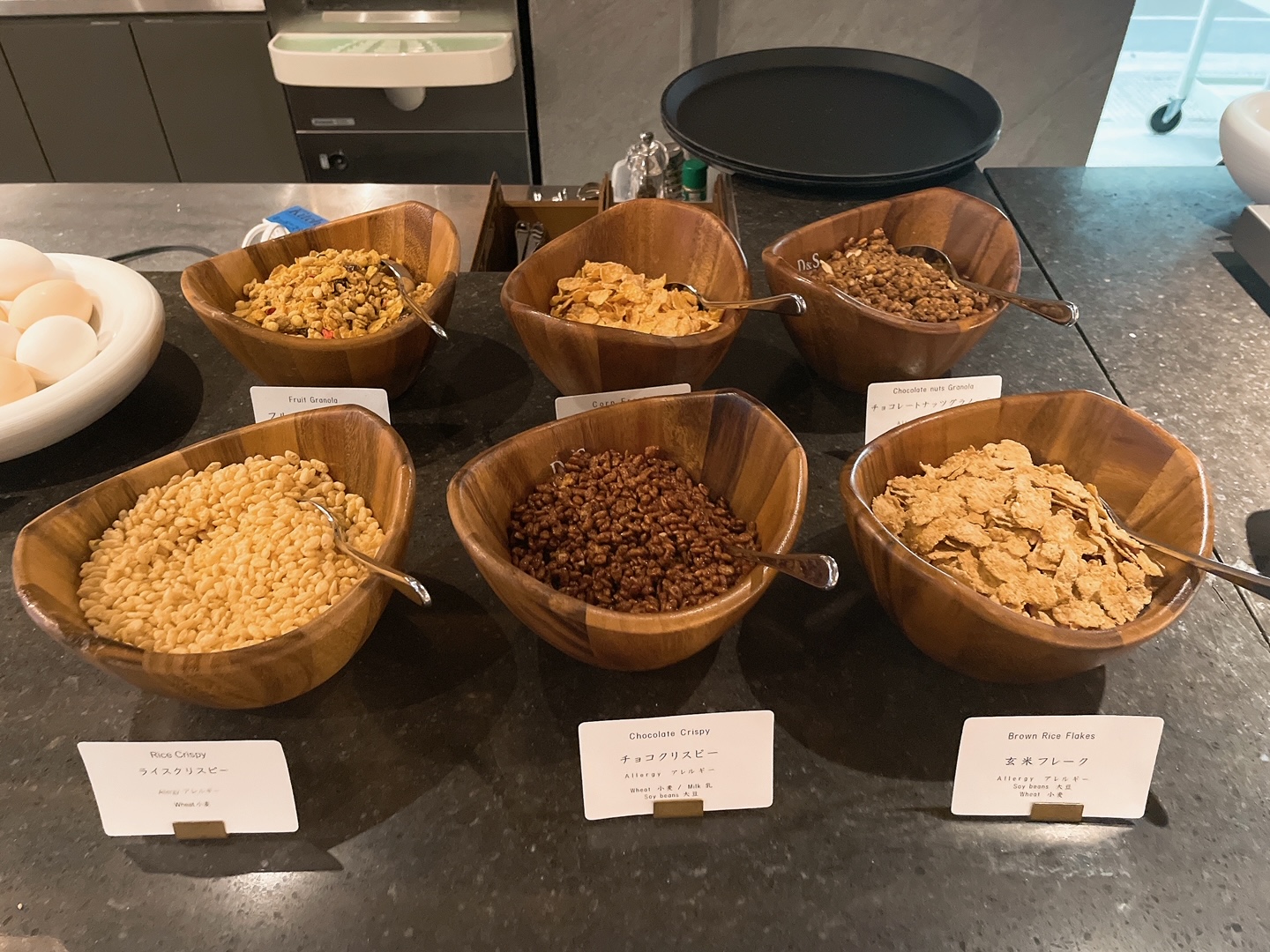 玄米フレーク、チョコクリスピー、ライスクリスピー、チョコレートナッツグラノーラ、コーンフロスティ、フルーツグラノーラ