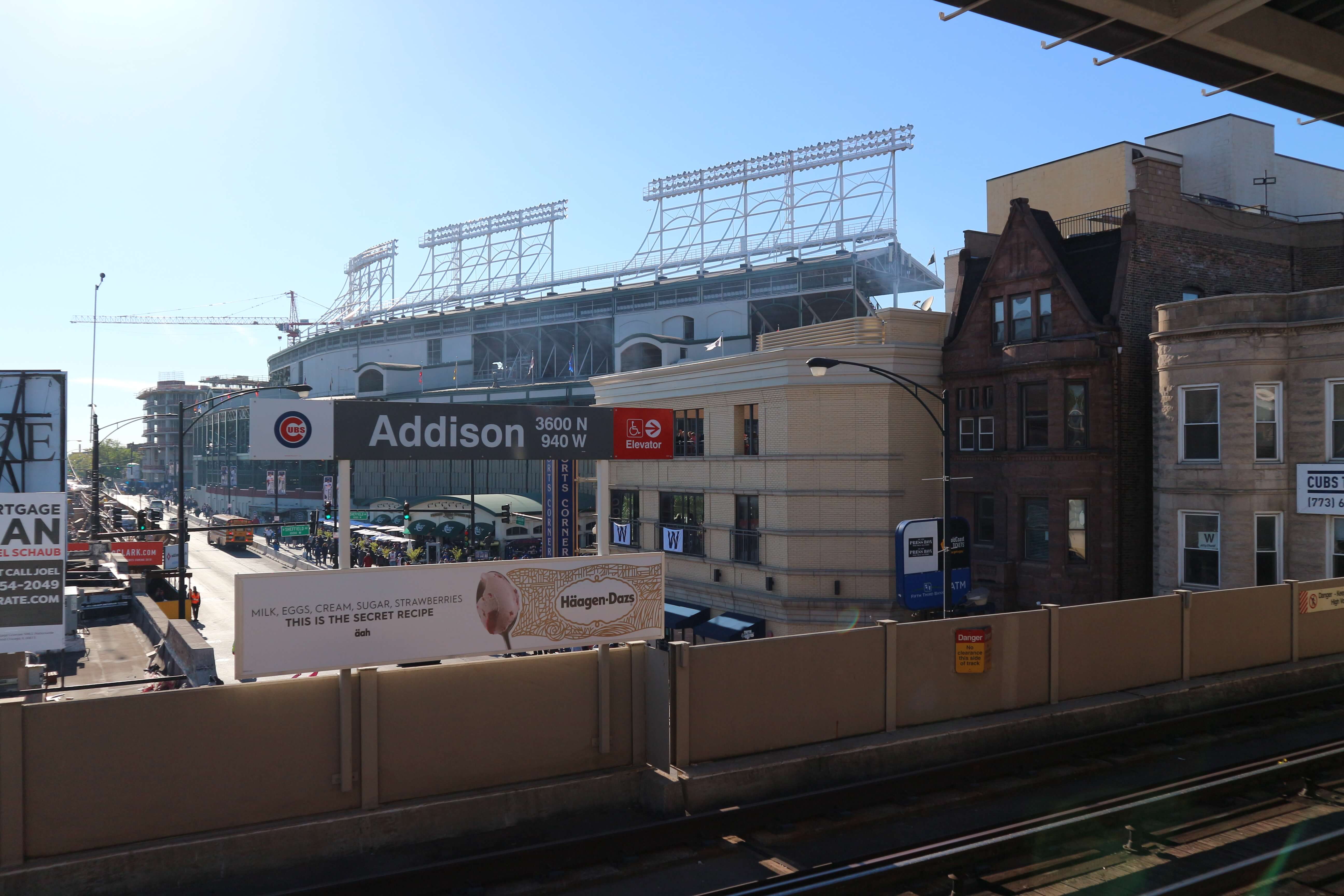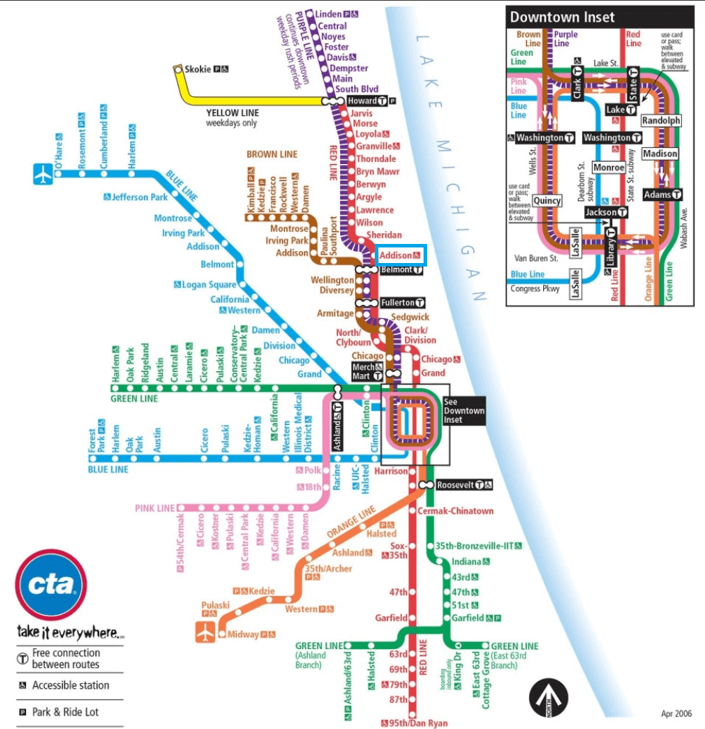ダウンタウン中心部からCTA(シカゴ市交通局)のレッドラインで約15-20分ほどのAddison(アディソン)駅が最寄りです。下の路線図で水色四角で囲った駅です。