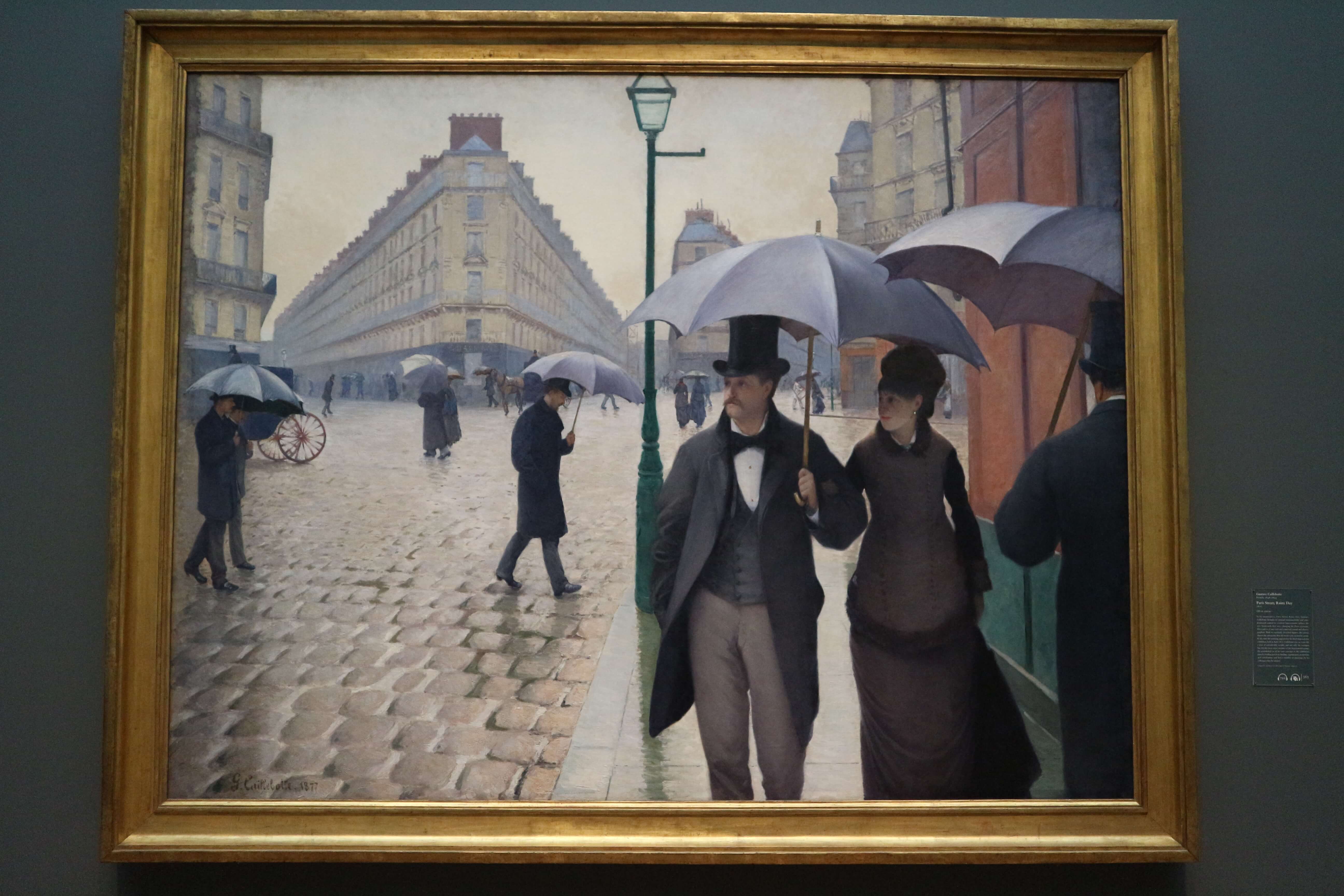 最初に目につくのはカイユボットの「パリの通り、雨の日」。まるで写真か映画のような初期印象派の作品です。