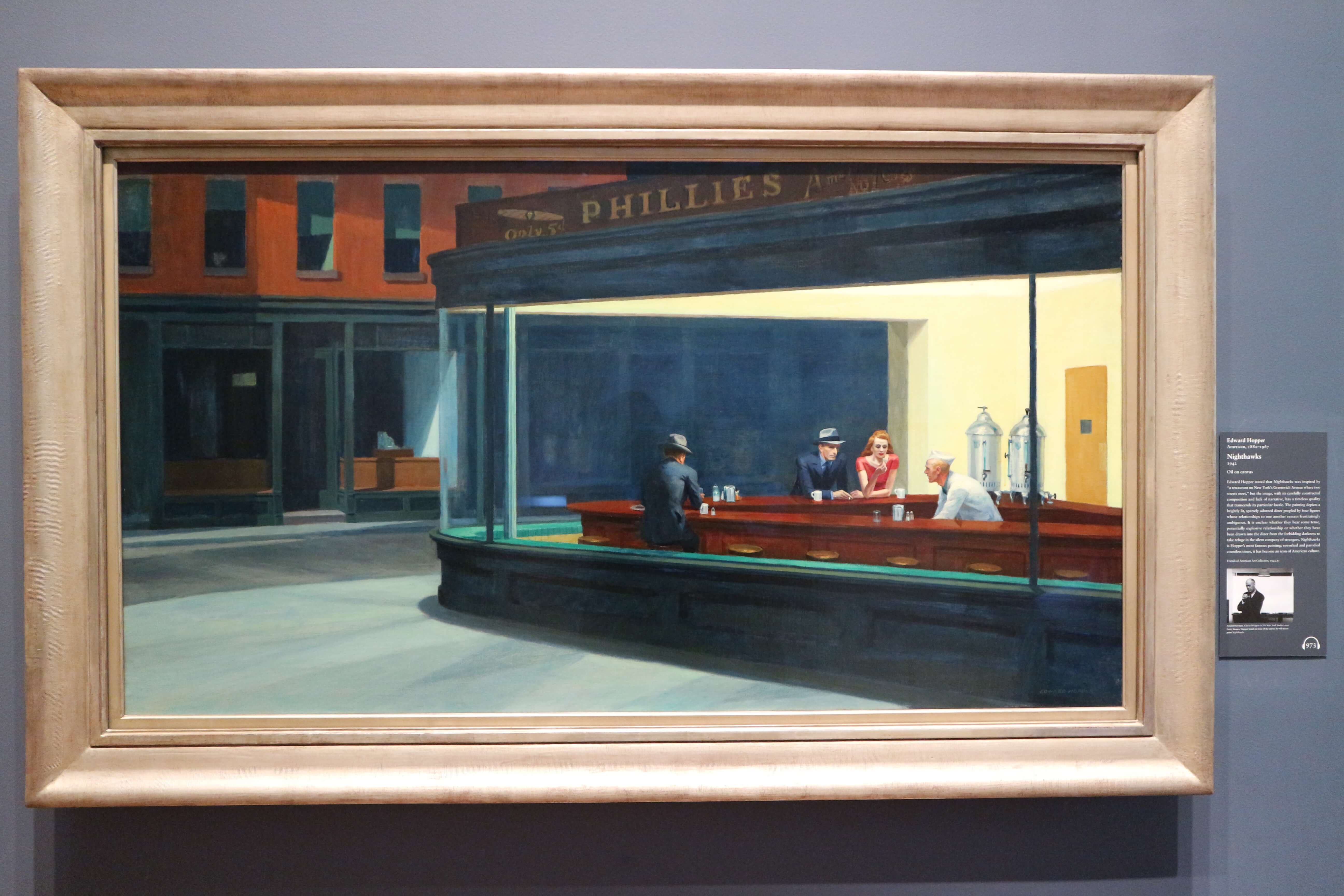 まずはホッパーの「ナイトホークス」。カラフルなヨーロッパ絵画とはちょっと違って光と影が印象的です
