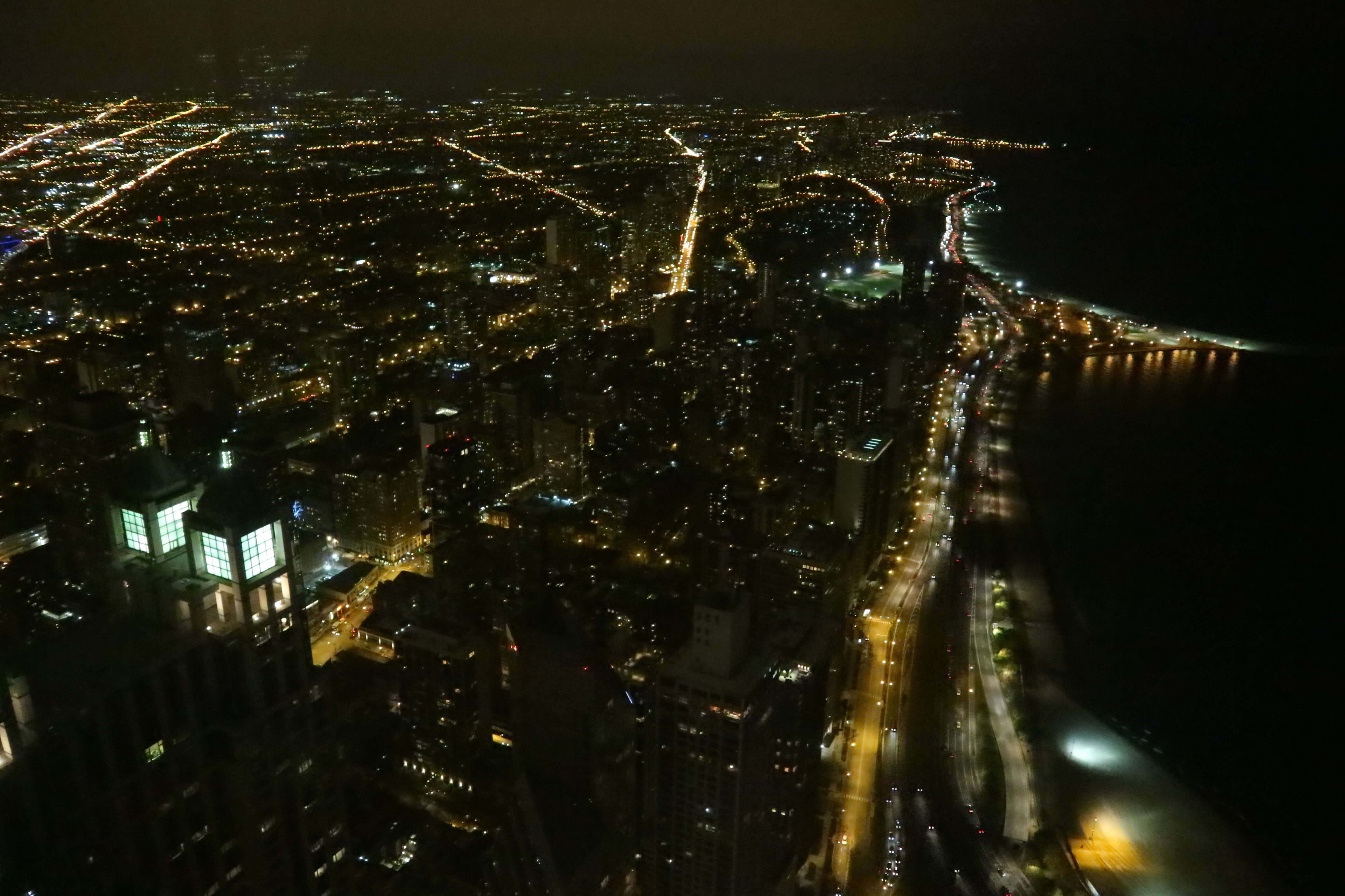 北側は南側に比べると光量が少なく寂しい感じですがミシガン湖岸を走る車のヘッドライトや街灯が目立ちます。