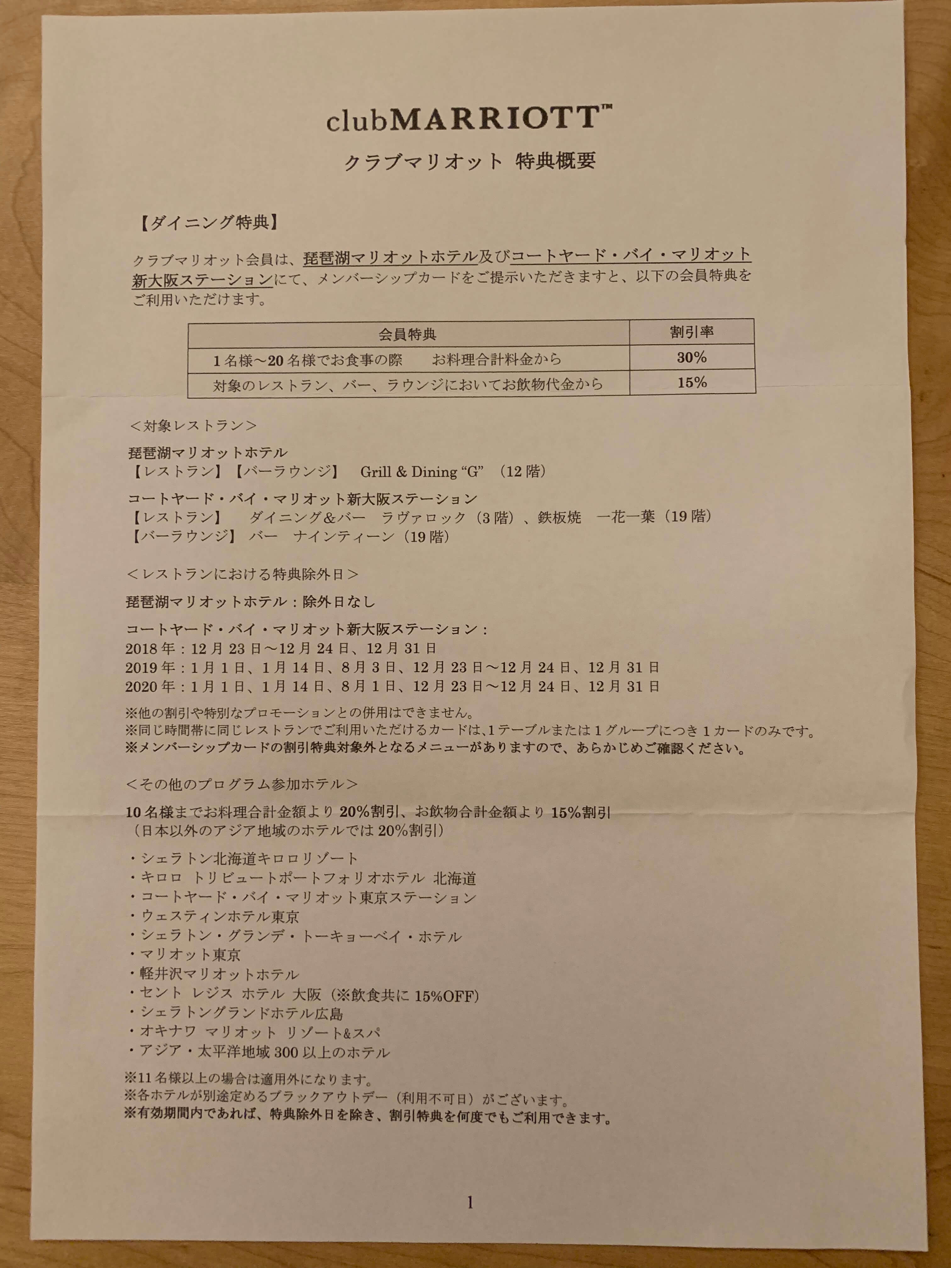 クラブマリオットに入会すると会員証とともに入会したホテルで利用できる優待券が一緒に送られてきます。琵琶湖マリオットホテルとコートヤード・バイ・マリオット新大阪ステーションでクラブマリオットに入会すると何と30枚(2021年からは20枚に変更)もの優待券が束になった冊子が送られてきます。(写真は仮会員証ですが…)