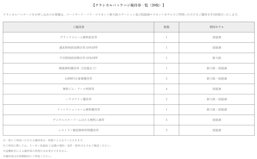 琵琶湖マリオットホテルとコートヤード・バイ・マリオット新大阪ステーションで利用できる優待券の内容