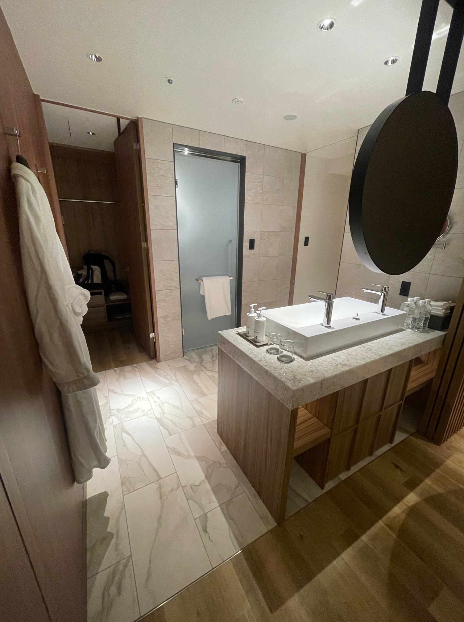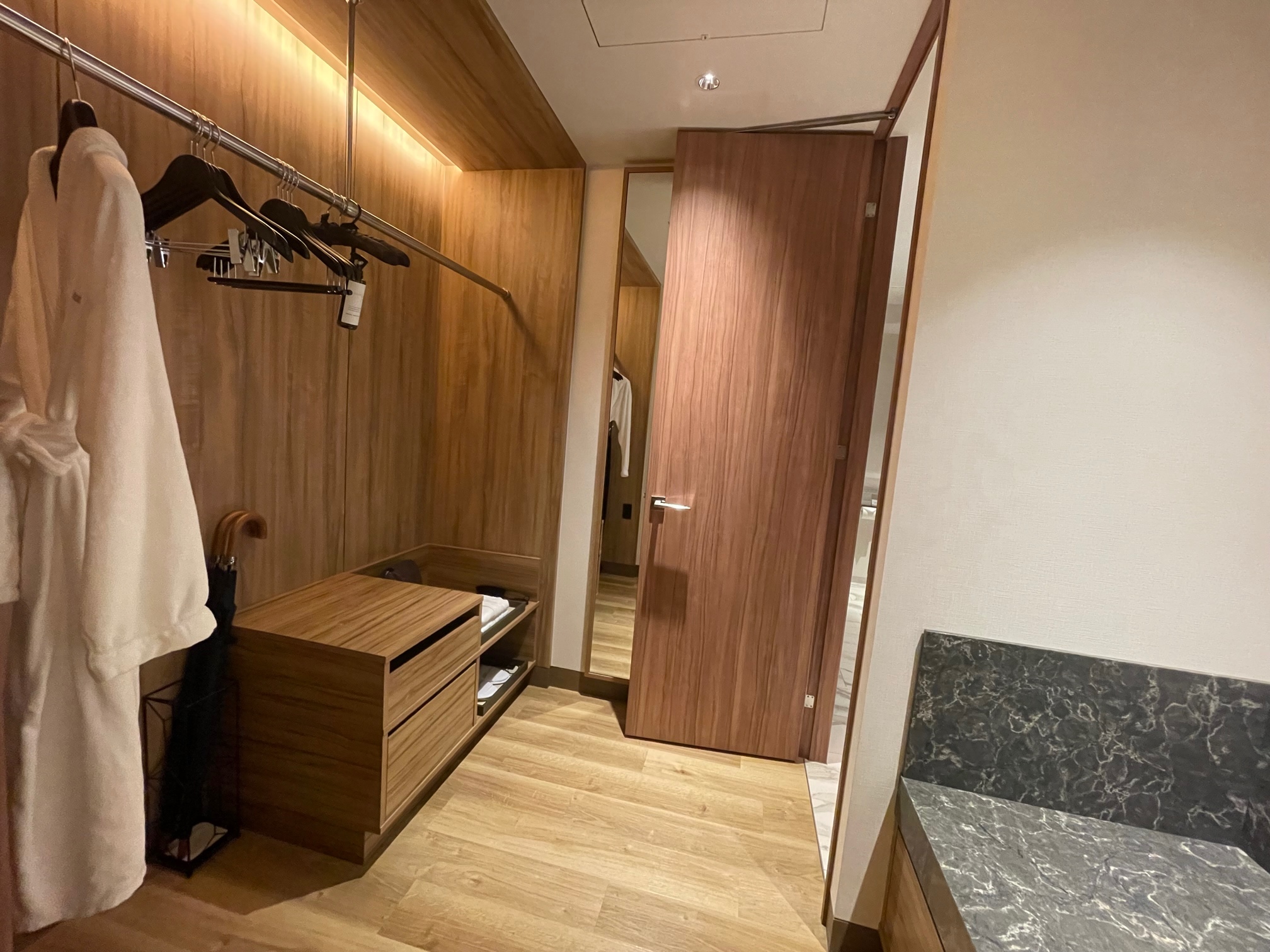 ウォークインクローゼットを反対側の扉に抜けると後ほどご紹介する洗面所やベッドルームにつながっています。下の写真右側のバゲージスペースは石が使われておりなかなか立派でした