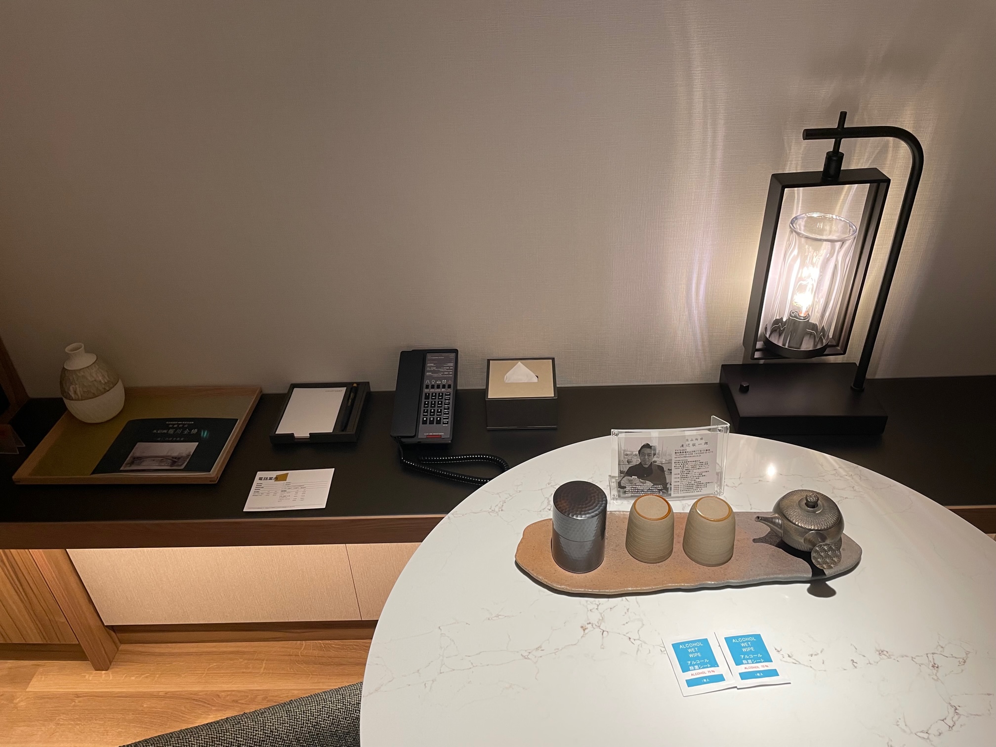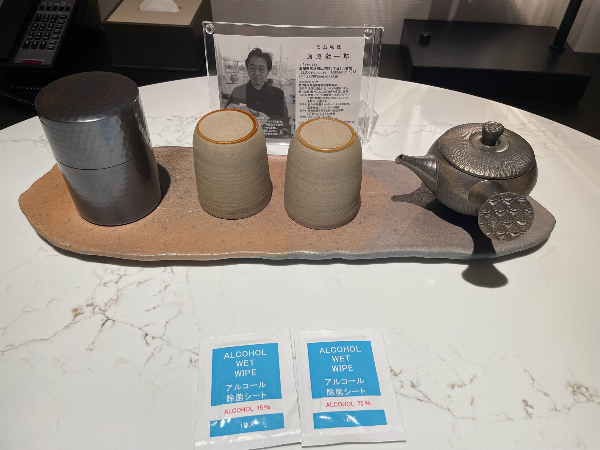 テーブルの上の茶器は有名な陶芸家の作品のようで写真と共に置かれていました