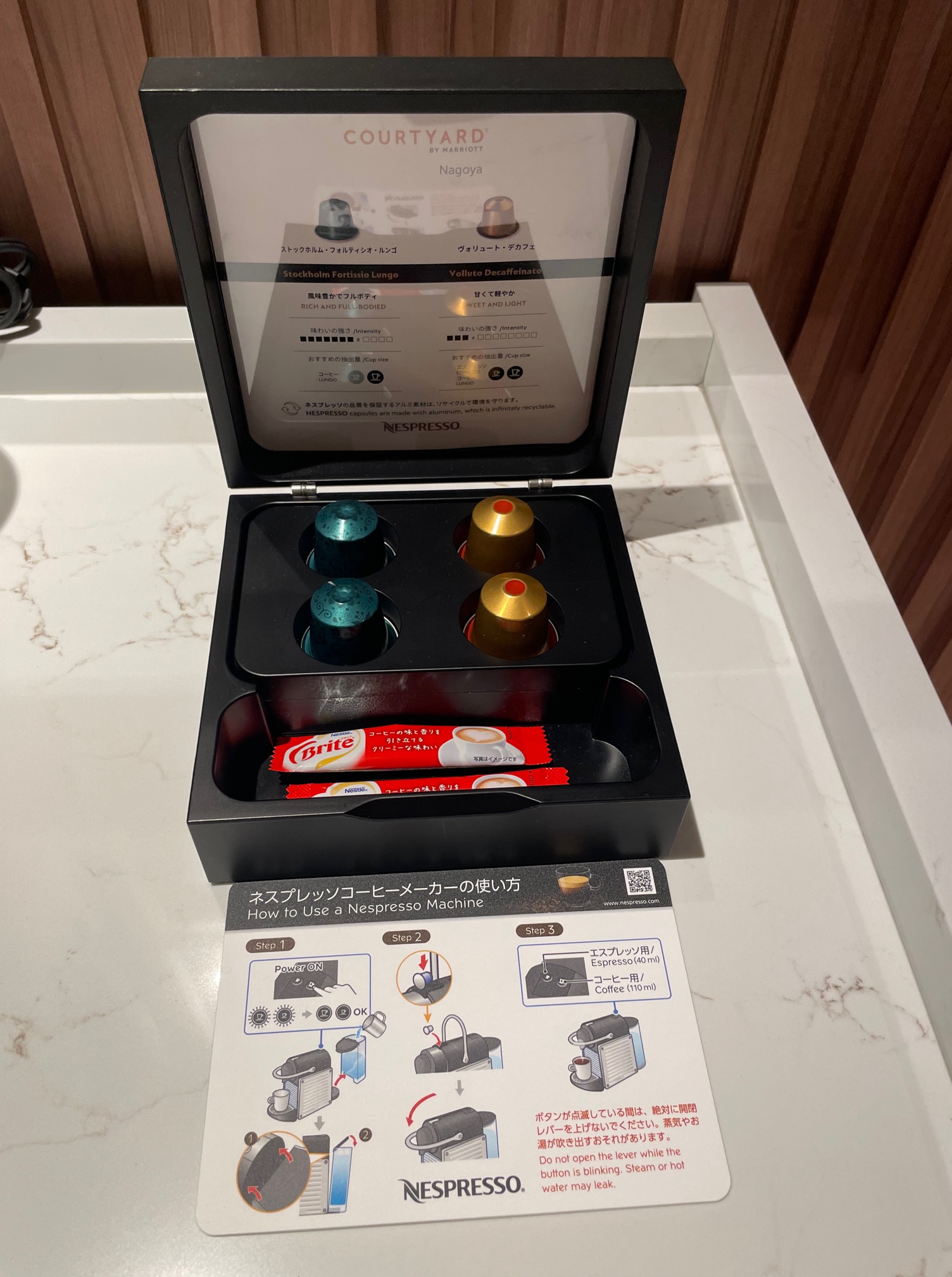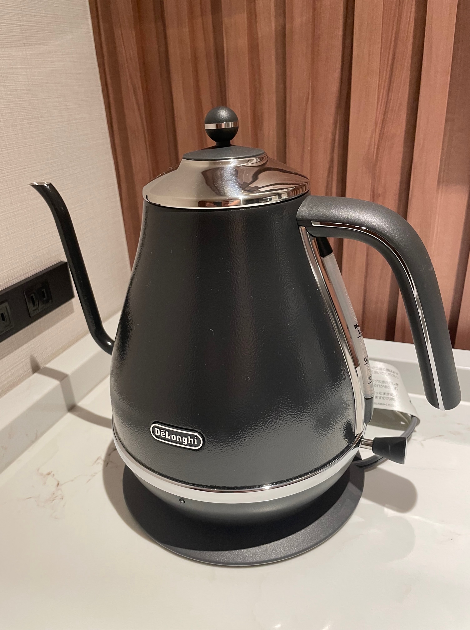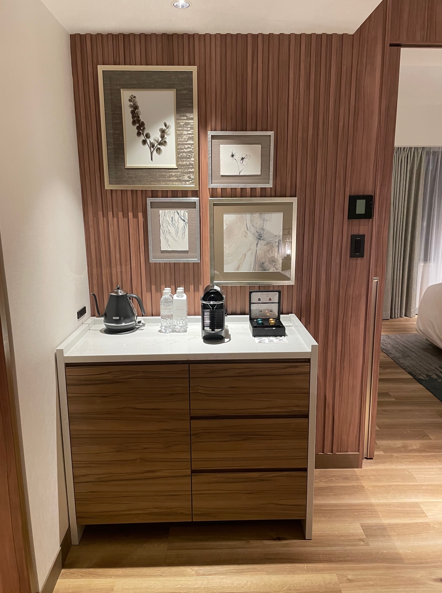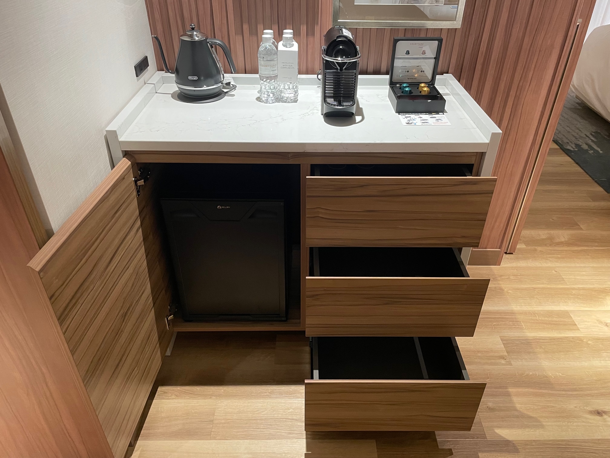 キャビネット上には電気ケトル、無料のミネラルウォーター、ネスプレッソが置かれています。